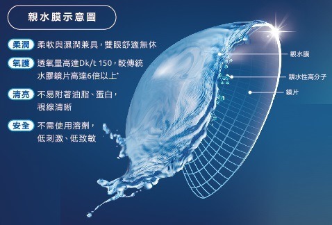林依晨寶貝雙眼,隱形眼鏡最重視高透氧與柔潤。全新「美若康沐氧」、「美若康藍氧」矽水膠隱形眼鏡,皆採用專利EautrasilTM親水矽科技TMII,高透氧親水膜使鏡片表面潤滑,透氧量達Dk/t 150,較傳統水膠高6倍以上,氧氣持續傳達至雙眼,使透氧量常保理想值。