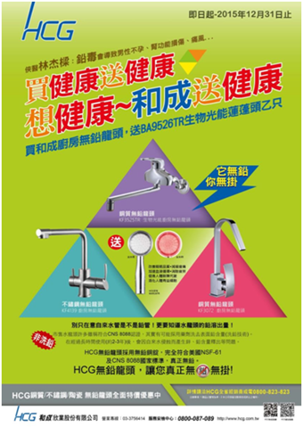 為了讓國人用水安全無”鉛”無掛,HCG特別推出「買健康送健康」活動,即日起至2015年12月31日止凡購買和成廚房無鉛龍頭(不限型號)即贈送生物光能蓮蓬頭乙只,讓民眾遠離毒害、享受健康喔~