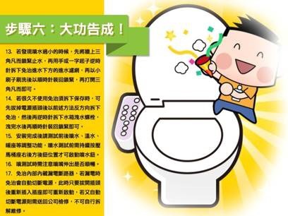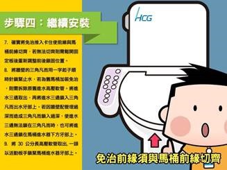 步驟六:完成安裝後,可測試噴水、溫水、暖座等功能,如能正常運作,就大功告成囉!如果不會安裝、安裝後無法正常使用,或有任何不確定的問題,最好還是請專業人員協助喔~HCG的據點很多,非常方便:http://www.hcg.com.tw/Location/