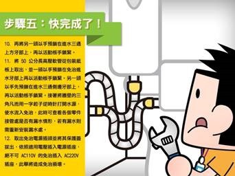 步驟五:安裝完高壓軟管後,打開水源測試各零件接管是否有漏水,漏水處需重新安裝。另外要特別注意,絕不可將AC110V的電源插入AC220V的插座中喔~