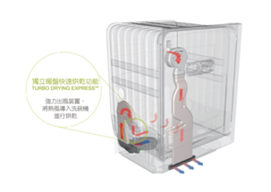 最重要的一點,有些洗碗機在洗完後,需將門打開等待乾燥,讓裡面的蒸氣散發或靠餘溫烘乾後,才能將碗盤放入櫥櫃裡,否則機內的熱氣無法釋出,造成碗盤濕答答不容易乾。如果不想把時間都花在長久的等待上,可用Turbo Drying烘乾技術的ASKO洗碗機,它在烘乾時會啟動抽氣風扇,將機內的熱氣抽入門內的冷凝管,水氣經冷凝後排出,因而達到良好的烘乾效果,而多出來的時間不但可做自己想做的事,也可多陪陪家人,一舉數得!