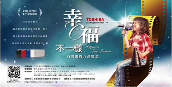 硬碟機領導品牌台灣東芝電子零組件(TOSHIBA),今年夏天(2016年)舉辦『第四屆東芝幸福影展_幸福不一樣』,活動自即日起開展徵件,投稿日期至7月底截止。除了首獎獎金高達新台幣8萬元,今年更邀請到《我可能不會愛你》導演瞿友寧、影評膝關節、前台北電影節總監黃鴻端擔任影片評審。只要上傳作品的Youtube連結到幸福影展的活動網址 http://www.toshiba-filmfestival.com/,並填寫報名資料,就有機會獲得高額獎金。