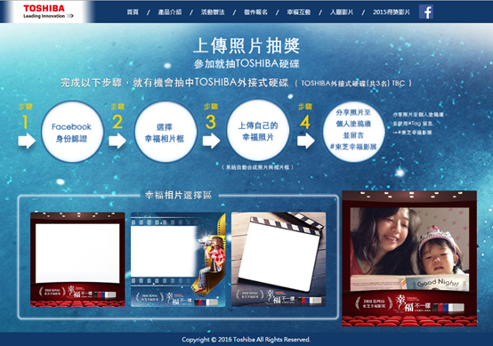 今年東芝幸福影展也針對相片作品進行活動,只要參與網站中的上傳照片互動,分享你的幸福照片並留言『#東芝幸福影展』,也能夠獲得抽TOSHIBA硬碟的機會!此外更針對入圍的作品舉辦人氣票選,讓導演們能夠和網友增進互動,讓這些充滿幸福感的影片,能夠被更多人看見。