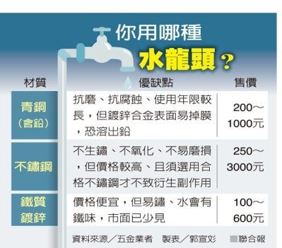 國內家庭使用的水龍頭大多是「銅鉛合金」材質,鉛元素與空氣接觸後,會氧化生成一層保護膜,長期自來水沖洗下,保護膜會脫落浸入水中,造成鉛元素釋出。為解決用水而淨化水質,自來水公司使用氯做為消毒劑,而水中殘留的「餘氯」則加速水龍頭老化。據研究分析,使用六年以上的水龍頭,若切開水龍頭內部材質檢驗,其已變成銅綠色或黑色,「鉛」的釋放量會大幅增加。